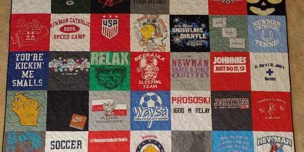 Quilt square size will depend on the size of the shirts and desired quilt size (usually 12-14" finished squares). Shirts with small chest emblems can be used as well. Shirts provided by the customer must be clean and in good shape. Backs of shirts can be used to increase the size of the quilt or offer contrast. Price includes batting, backing of your choice (within reason), thread, and Edge 2 Edge quilting with a computerized design of your choice.